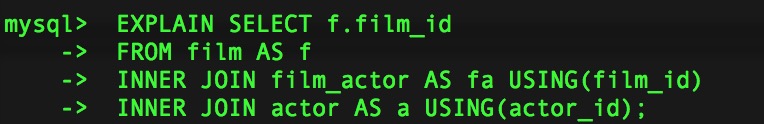 這一列顯示了之前的表在key列記錄的索引中查找值所用的列或常量,下面是一個(gè)展示關(guān)聯(lián)條件和別名組合的例子,注意,ref列反映了在查詢文本中film表是如何以f為別名的:
