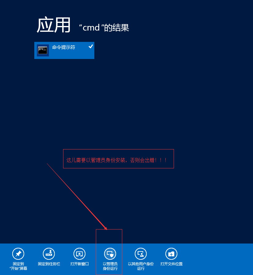 在安裝時(shí),必須以管理員身份運(yùn)行cmd,否則在安裝時(shí)會(huì)報(bào)錯(cuò),會(huì)導(dǎo)致安裝失敗的情況,如下圖:
