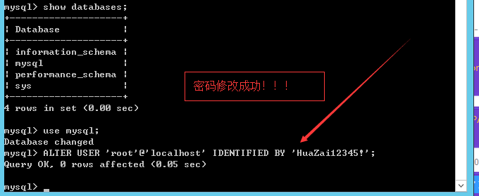 初始化登錄是不需要密碼的,直接輸入命令 “ mysql -uroot -p ” 直接回車(chē)登錄,顯示庫(kù)輸入命令 “ show databases; ”,連接到MySQL的庫(kù),輸入命令 “ user mysql; ” ,然后才修改MySQL密碼,輸入修改語(yǔ)句 “ ALTER USER 'root'@'localhost' IDENTIFIED BY 'HuaZai12345!'; ” 進(jìn)行修改,修改成功如下圖: