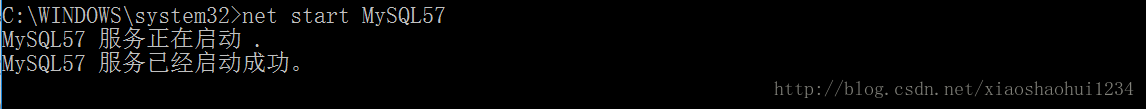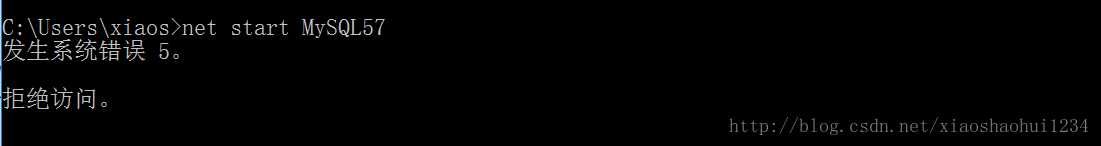 又出現(xiàn)錯誤,錯誤提示為“發(fā)生系統(tǒng)錯誤 5。拒絕訪問?!?經(jīng)過查找資料,發(fā)現(xiàn)這個問題的原因是沒有以管理員身份運行CMD,于是重新以管理員身份啟動CMD,再次輸入net start MySQL57 ,結(jié)果如圖: