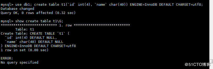 創(chuàng)建表 use db1; create table t1(id int(4), name char(40)) ENGINE=InnoDB DEFAULT CHARSET=utf8;