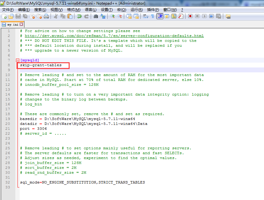 改好之后,再修改一下my.ini這個文件,把我們剛才加入的"skip-grant-tables"這行刪除,保存退出再重啟mysql就可以了。