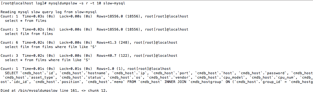 ]# mysqldumpslow -s r -t 10 slow-mysql