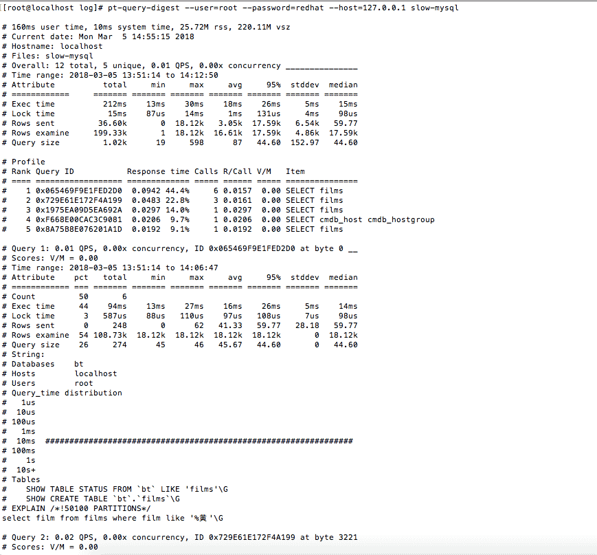 ]# pt-query-digest --user=root --password=redhat --host=127.0.0.1 slow-mysql > slow.rep