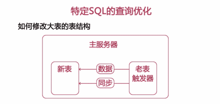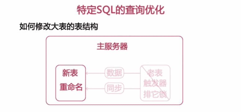 2、在主服務(wù)器上創(chuàng)建于一個(gè)新的表,表結(jié)構(gòu)就是將要修改大表后表結(jié)構(gòu),再把老表的數(shù)據(jù)重新導(dǎo)入到新表中,并在老表中建立一系列的觸發(fā)器,把老表的數(shù)據(jù)同步更新到新表中,當(dāng)老表中的數(shù)據(jù)全部同步到新表以后,再對(duì)老表加排它鎖,把新表改成老表的名稱,刪除重命名的老表,如下圖所示