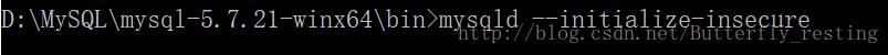 4. 以管理員身份進(jìn)入命令行(可在小娜搜索輸入cmd找到),并進(jìn)入X:\MySQL\mysql-5.7.21-winx64\bin目錄下輸入命令:mysqld --initialize-insecure (生成無密碼的root用戶) 后,在mysql-5.7.20-winx64 目錄下就會(huì)出現(xiàn)data文件