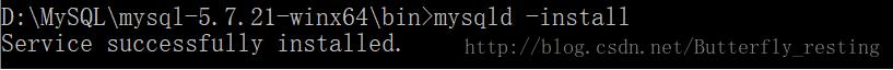 5.再輸入mysqld --install,如果出現(xiàn)Service successfully installed 說明注冊(cè)成功了。