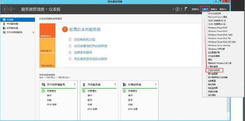 在Windows Server2012中,我們進(jìn)入服務(wù)器管理面板,點(diǎn)擊右上角菜單欄中的“工具”,選擇其中的“任務(wù)計劃程序”: