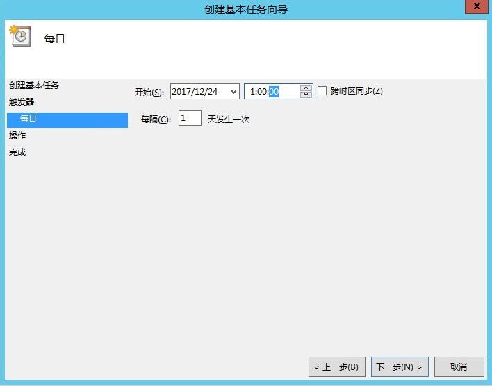 再次點(diǎn)擊“下一步”,設(shè)置任務(wù)執(zhí)行的時間,我選擇了夜深人靜的1點(diǎn):