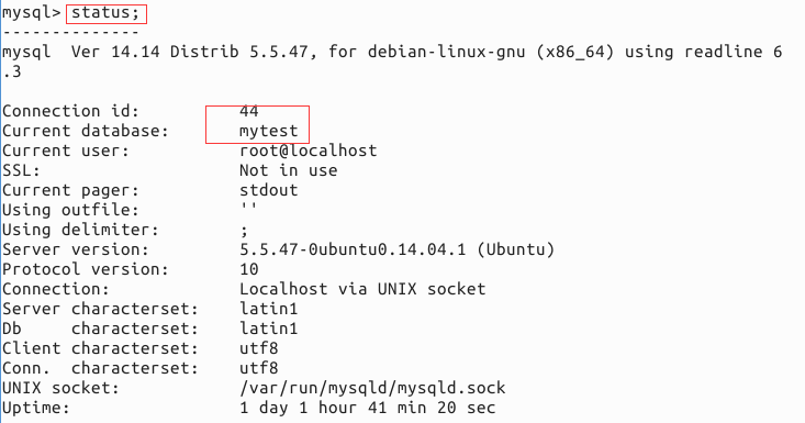 2.4在上面4個(gè)數(shù)據(jù)庫(kù)中,如何選擇我們的想要的數(shù)據(jù)庫(kù)呢?usemytest,這樣就選中了我們的數(shù)據(jù)庫(kù)mytest.