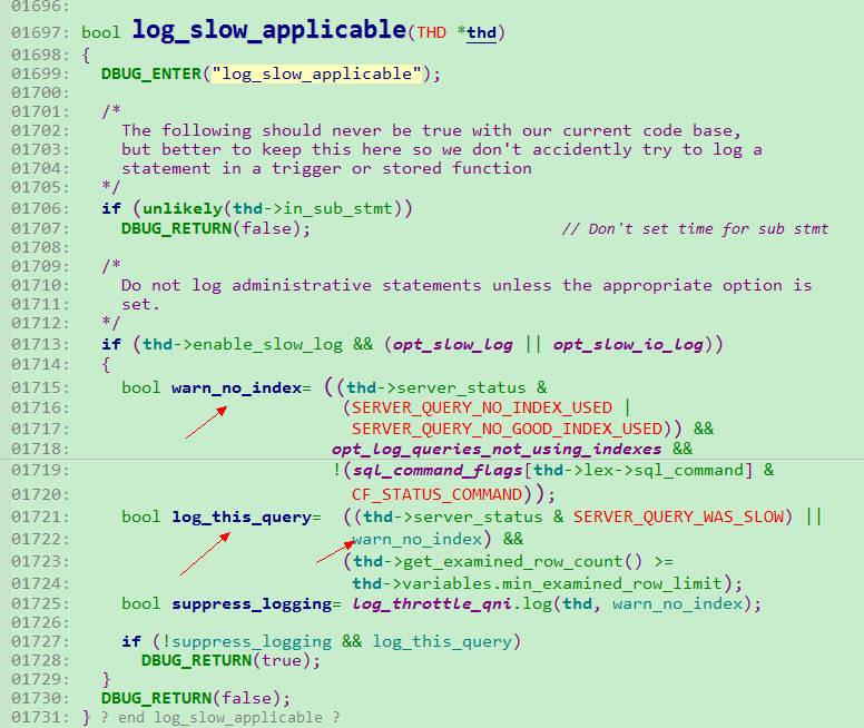 上圖是記錄慢日志的主邏輯,是否記錄日志由函數(shù) log_slow_applicable 控制,該函數(shù)先前已分析了一部分,我們進一步看該函數(shù)的其他相關內容,見下圖紅框: