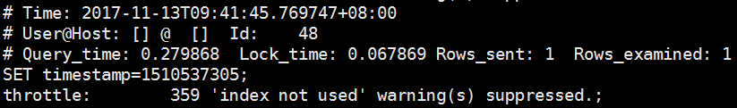 對應到該線上問題,log_throttle_queries_not_using_indexes 被設置為 10,在日志文件中看到周期性打印了如下內容: