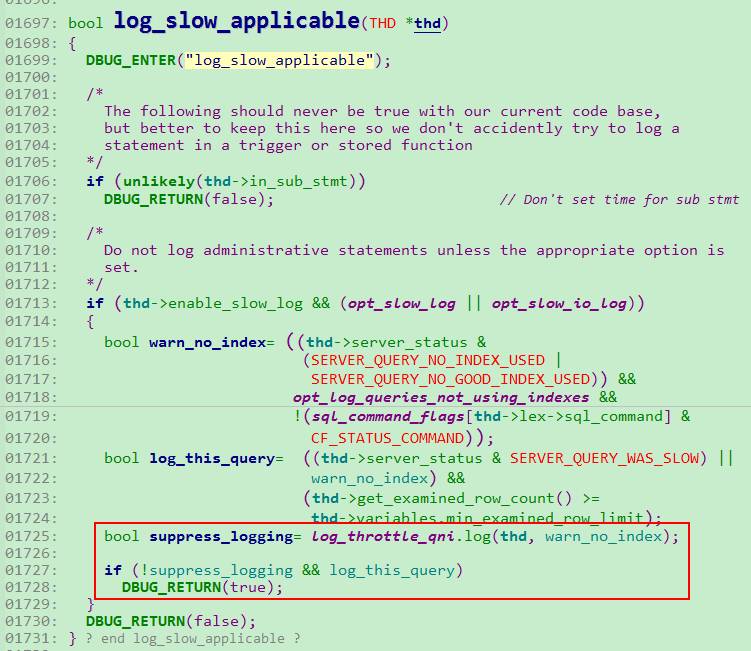 Suppress_logging 是個決定性的變量,只有它為 false,該 SQL 語句才可能被記錄。其結果就跟 log_throttle_queries_not_using_indexes 相關,我們進一步看下 log_throttle_qni.log 相關實現(xiàn),如下圖: