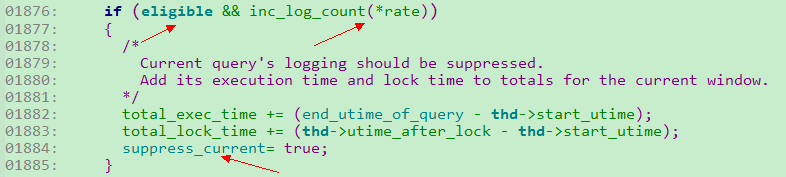 Eligible 即為 warn_no_index,inc_log_count() 函數(shù)在 1 分鐘內不走索引的語句總數(shù)超過 log_throttle_queries_not_using_indexes 時返回值為 true,只有 warn_no_index 和 inc_log_count() 返回值都為 true,suppress_current 才為 true,而 suppress_current 即為 suppress_logging。