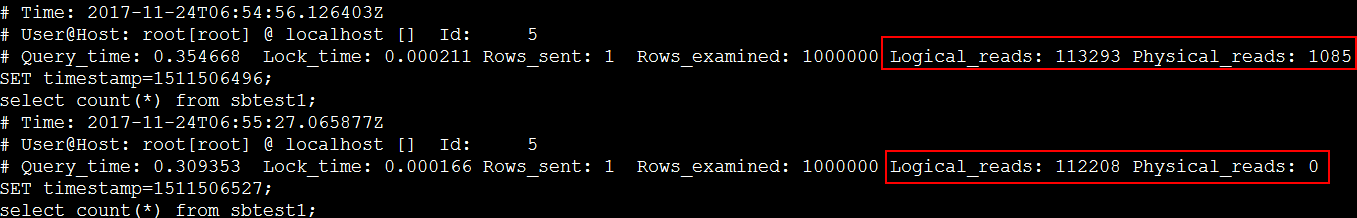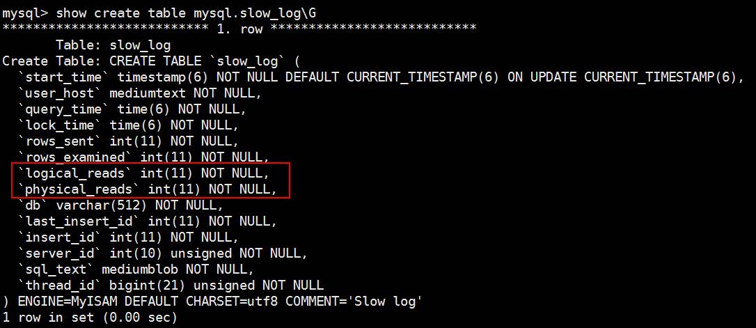 上圖即為 InnoSQL 版的 slow_log 表結構,其中,logical_reads 和 physical_reads 為 InnoSQL 增加字段。同樣的,慢日志文件的輸出內容也增加了兩個字段,如下所示: