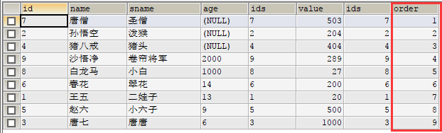 SELECT * FROM (SELECT * FROM table_a a INNER JOIN table_b b ON a.id=b.ids UNION ALL SELECT 8 id,'白龍馬' `name`,'小白' sname,'1000' age ,8 ids, 27 `value` UNION ALL SELECT 9 id,'沙悟凈' `name`,'卷簾將軍' sname,'2000' age ,9 ids, 289 `value`)A INNER JOIN (SELECT 7 ids, 1`order` UNION ALL SELECT 2 ids, 2`order` UNION ALL SELECT 4 ids, 3`order` UNION ALL SELECT 9 ids, 4`order` UNION ALL SELECT 8 ids, 5`order` UNION ALL SELECT 6 ids, 6`order` UNION ALL SELECT 1 ids, 7`order` UNION ALL SELECT 5 ids, 8`order` UNION ALL SELECT 3 ids, 9`order` ) B ON B.ids=A.id ORDER BY B.order