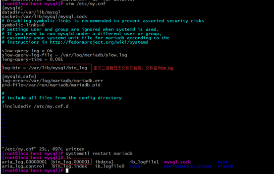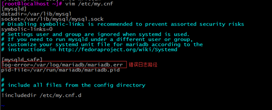 vim /etc/my.cnf //如下圖:我將錯(cuò)誤日志的路徑改為/var/log/mariadb/mariadb.err