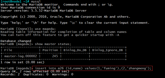 insert into m26 values (007,'fuming'),(008,'zhangmeng')