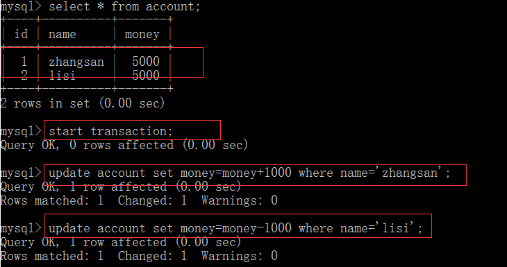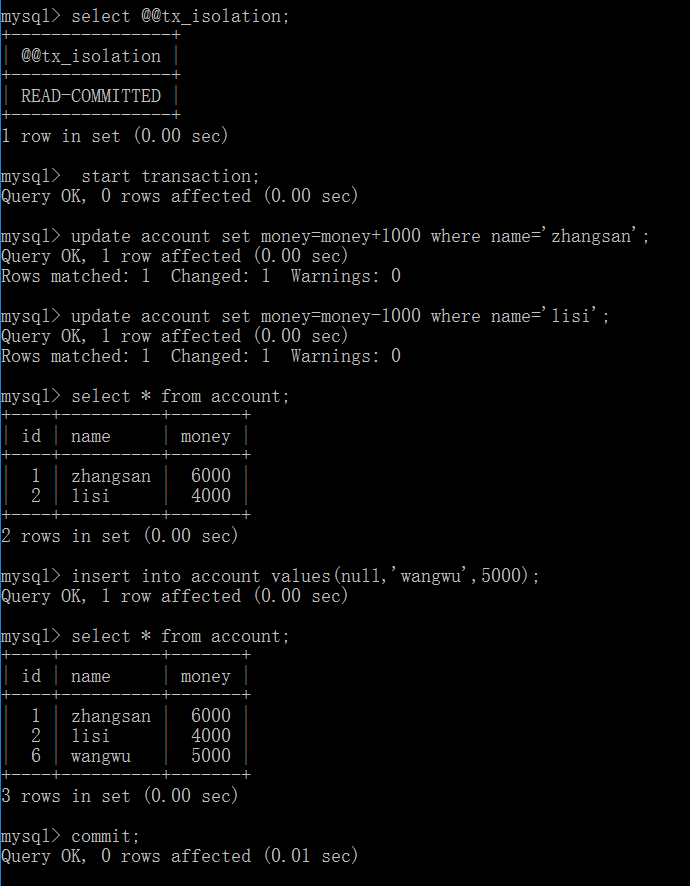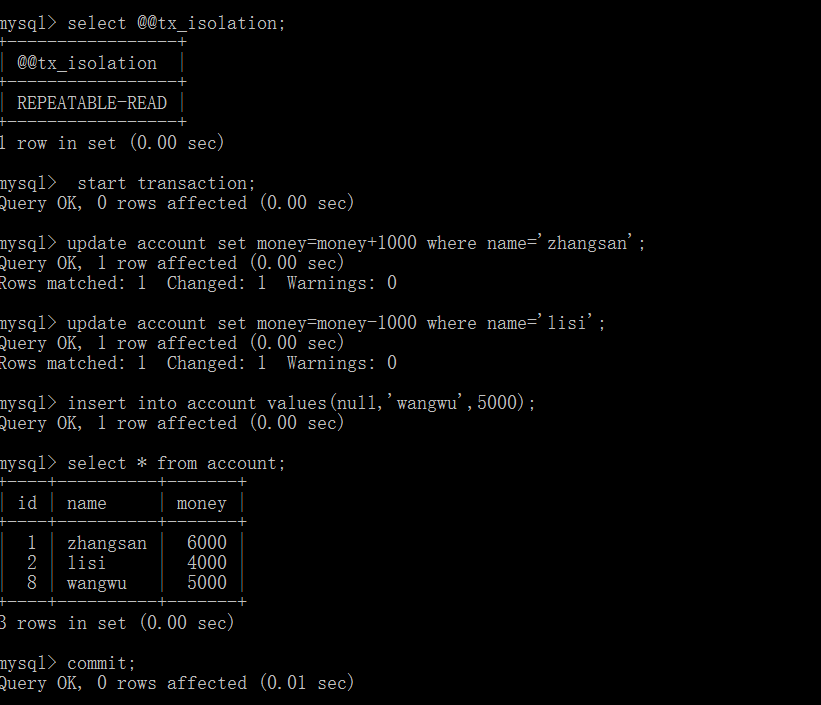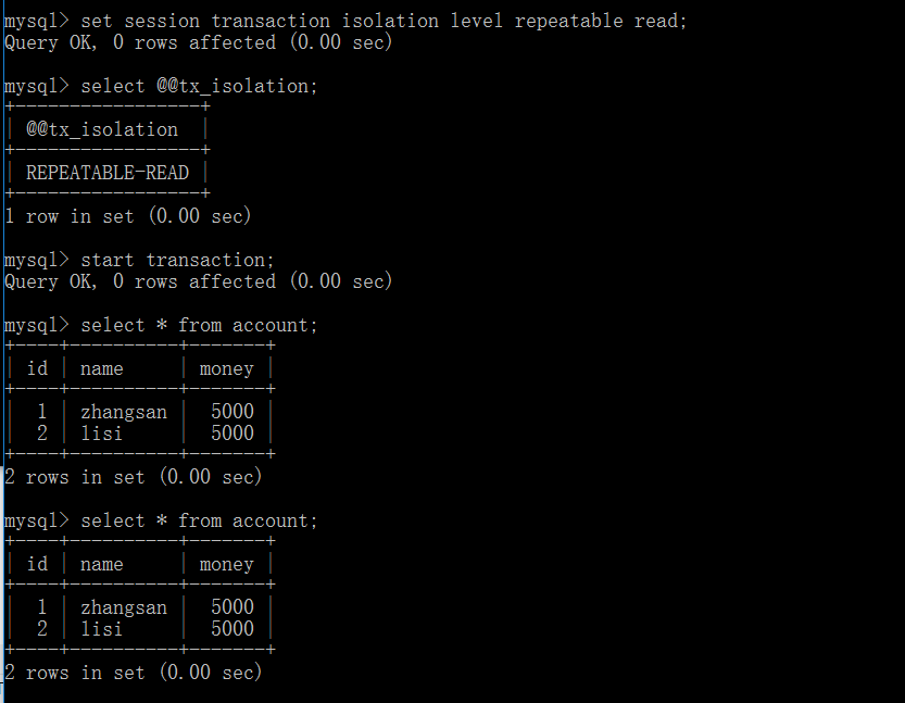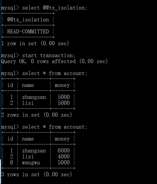 數(shù)據(jù)庫(kù)表原始數(shù)據(jù)money都是5000,當(dāng)我啟動(dòng)事務(wù)后,在zhangsan賬戶(hù)增加了1000和在李四賬戶(hù)減去了1000,但是我的事務(wù)還未提交,但是我再次查詢(xún)數(shù)據(jù)庫(kù)表時(shí),數(shù)據(jù)已經(jīng)發(fā)生變化,這就是臟讀和不可重復(fù)讀!