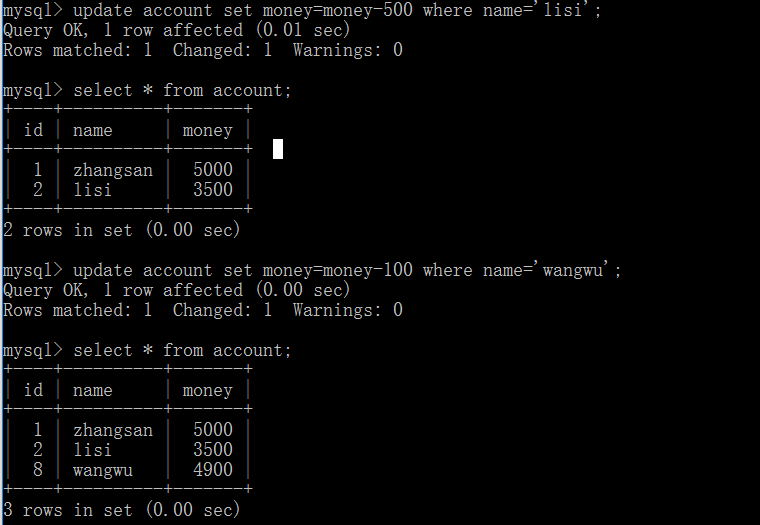update account set money=money+1 where name='B'; --此時(shí)A去通知B update account set money=money -1 where name='A';