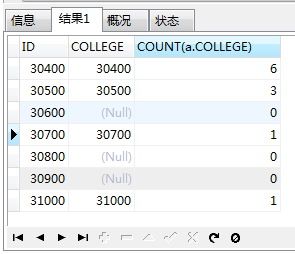 但是a.COLLEGE為空的行的數(shù)據(jù)中值都是1,這不是我們想要的,所以我們把count(*)改成count(a.COLLEGE),這樣數(shù)據(jù)就出來(lái)了。