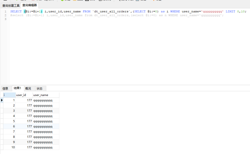 SELECT (@i:=@i+1) i,user_id,user_name FROM `dt_user_all_orders`, (SELECT @i:=0) as i WHERE user_name='qqqqqqqqqq' LIMIT 0,10;