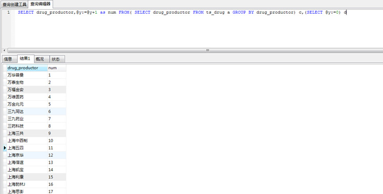 SELECT drug_productor,@y:=@y+1 as num FROM( SELECT drug_productor FROM ts_drug a GROUP BY drug_productor) c,(SELECT @y:=0) d