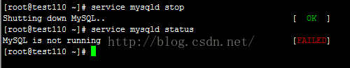 (2)如果正在運行則執(zhí)行service mysqld stop或者service mysql stop命令停止MySQL服務,根據(jù)開機初始化目錄下mysql腳本的文件名而定,我這里是mysqld