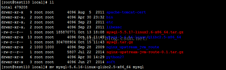 (2)執(zhí)行命令:mv mysql-5.6.16-linux-glibc2.5-x86_64 mysql重命名解壓后的文價夾為mysql