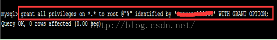 (3)創(chuàng)建遠程登錄用戶并授權,執(zhí)行命令:grant all privilegeson *.* to root @"%" identified by '123456' WITH GRANT OPTION;