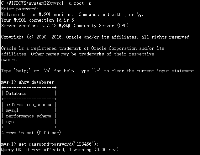 update mysql.user set authentication_string=password('123456') where user='root' and Host = 'localhost';//修改密碼