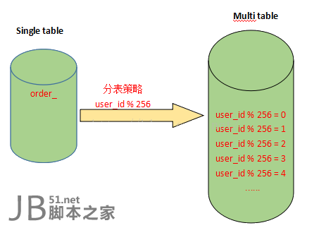 拆分的記錄根據(jù)user_id%256取得對(duì)應(yīng)的表進(jìn)行存儲(chǔ),前臺(tái)應(yīng)用則根據(jù)對(duì)應(yīng)的user_id%256,找到對(duì)應(yīng)訂單存儲(chǔ)的表進(jìn)行訪問。