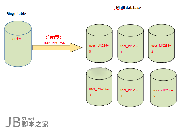 還是之前的訂單表,假設(shè)user_id 字段的值為258,將原有的單庫分為256個(gè)庫,那么應(yīng)用程序?qū)?shù)據(jù)庫的訪問請(qǐng)求將被路由到第二個(gè)庫(258%256 = 2)。
