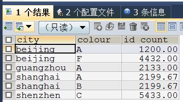 #多列分類匯總 SELECT city,colour,ROUND(SUM(price),2) AS id_count FROM data1 GROUP BY city,colour;