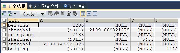#對空值進(jìn)行處理 CREATE VIEW data1_Extended_Pivot_Pretty AS ( SELECT city, COALESCE(A, 0) AS A, COALESCE(B, 0) AS B, COALESCE(C, 0) AS C, COALESCE(F, 0) AS F FROM data1_Extended_Pivot );