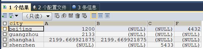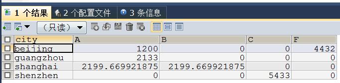 #對字段進(jìn)行求和匯總 CREATE VIEW data1_Extended_Pivot AS ( SELECT city, SUM(A) AS A, SUM(B) AS B, SUM(C) AS C, SUM(F) AS F FROM data_Items GROUP BY city );