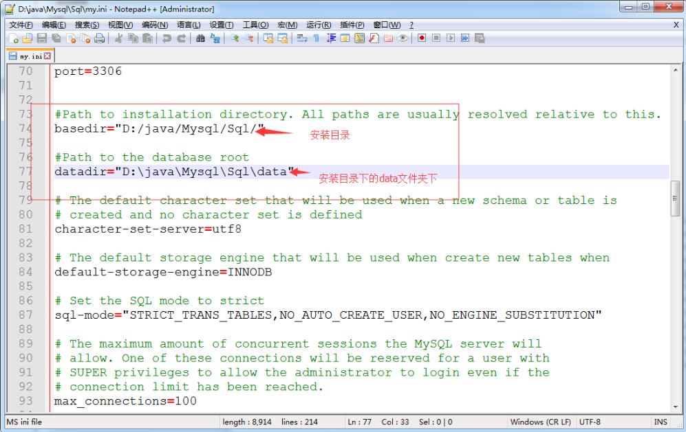 由于使用的是安裝版本,所以My.ini下的Datadir沒有修改,所以報錯,啟動找不到數(shù)據(jù)文件,所以需要把my.ini 文件中的Datadir 改成你安裝路徑下的data文件