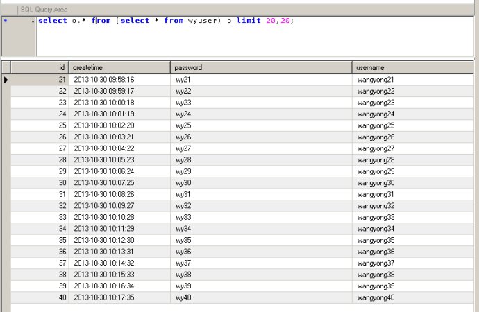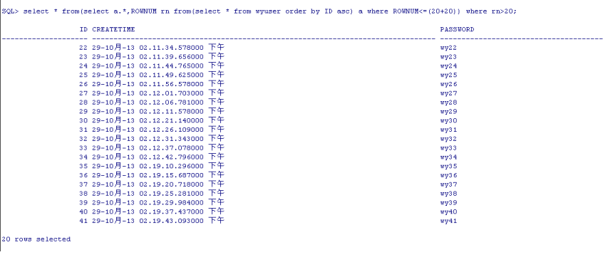 查詢(22-41)這20條記錄*****(沒有ID=6的記錄,所以開始查詢到的ID為22,以及最大ID為41)