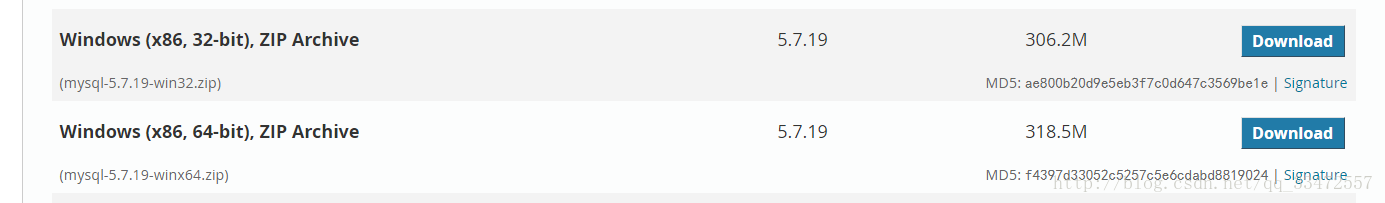 5.7 32位https://dev.mysql.com/get/Downloads/MySQL-5.7/mysql-5.7.19-win32.zip