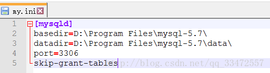 [mysqld] basedir=D:\Program Files\mysql-5.7\ datadir=D:\Program Files\mysql-5.7\data\ port=3306 skip-grant-tables #basedir表示mysql安裝路徑 #datadir表示mysql數(shù)據(jù)文件存儲(chǔ)路徑 #port表示mysql端口 #skip-grant-tables表示忽略密碼
