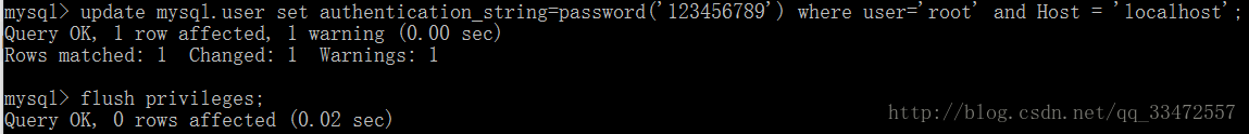 update mysql.user set authentication_string=password('123456789') where user='root' and Host = 'localhost';