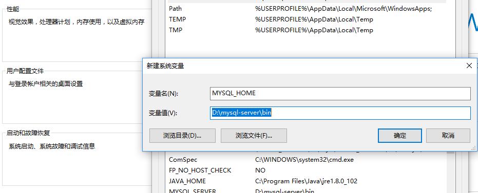 變量名可以根據(jù)喜好隨便取,我這里叫做MYSQL_HOME,變量值是你剛剛下載的mysql文件夾所在的目錄,我們指向其中的bin目錄,然后一路確定返回