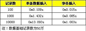 這里也提供了測(cè)試對(duì)比,分別是不使用事務(wù)與使用事務(wù)在記錄數(shù)為1百、1千、1萬的情況。