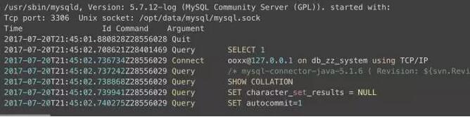 我這里只是每天在出問(wèn)題的前后半小時(shí)開(kāi)啟下全量日志,結(jié)果沒(méi)有發(fā)現(xiàn)任何 MySQL-client 請(qǐng)求到我們的業(yè)務(wù)數(shù)據(jù)庫(kù)!該日志格式如下,記錄了所有的連接與命令: