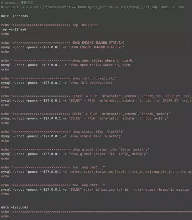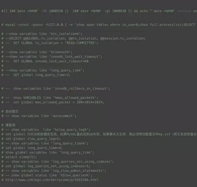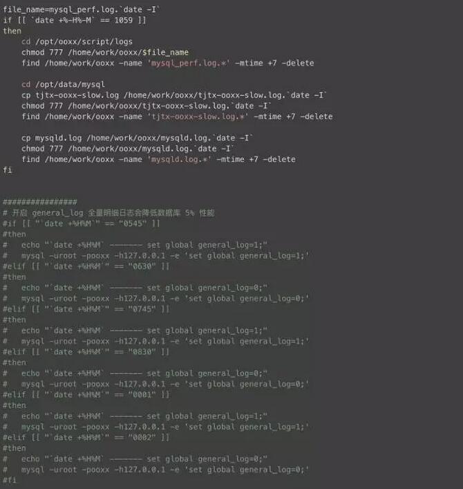 由于凌晨是數(shù)據(jù)倉(cāng)庫(kù)的業(yè)務(wù)高峰,很多問(wèn)題都是在這個(gè)時(shí)候爆發(fā),一些詭異的問(wèn)題往往是過(guò)了這個(gè)村就沒(méi)這個(gè)店了,白天無(wú)法復(fù)現(xiàn)。如何能捕獲我們關(guān)心的日志,便于快速的定位問(wèn)題,這個(gè)是重中之重,這里我寫(xiě)了個(gè)小腳本,crontab 部署,可以選擇時(shí)間范圍開(kāi)啟,每分鐘采樣一次日志,需要說(shuō)明的是 general log 沒(méi)事別輕易開(kāi)啟,否則對(duì)數(shù)據(jù)庫(kù)性能損耗較大。