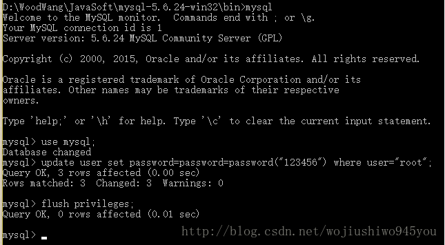 關(guān)閉MySQL服務(wù):net stop MySQL 以管理員身份打開cmd控制臺窗口,進入MySQL所在目錄的bin目錄,執(zhí)行mysqld --skip-grant-tables 再另開一個cmd窗口直接執(zhí)行mysql命令(由于2操作已經(jīng)是無需授權(quán)即可訪問表,所以直接用mysql,不帶用戶名和密碼即可登錄) 切換到mysql數(shù)據(jù)庫:uses mysql; 修改user表的password字段: update user set password = password ( ‘123456' ) where user = ‘root'; 執(zhí)行刷新操作:flush privileges; 退出mysql:quit; 重啟MySQL服務(wù):net start MySQL