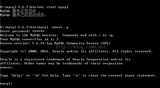 6.提示安裝成功后啟動MySQL服務,然后登錄MySQL驗證是否安裝成功,如下圖
