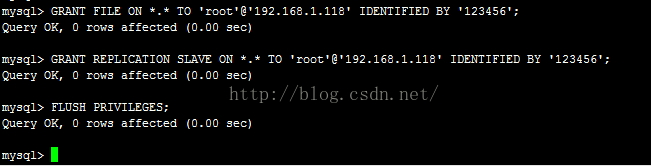 (3).登錄MySQL賦予從庫權限賬號,允許用戶在主庫上讀取日志,如下圖
