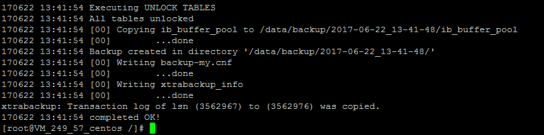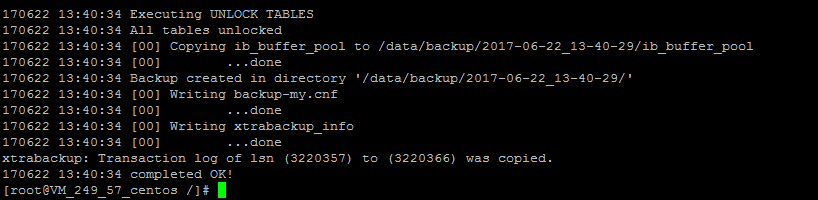 innobackupex --defaults-file=/etc/my.cnf --user=root --password=root --socket=/var/lib/mysql/mysql.sock --incremental /data/backup --incremental-basedir=/data/backup/2017-06-22_13-40-29