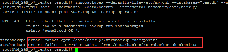 如果在進(jìn)行差異備份的時(shí)候,指定的完整備份的文件錯(cuò)誤或者是未指定完整備份文件,會(huì)發(fā)現(xiàn)xtrabackup提示找不到xtrabackup_checkpoints這個(gè)文件。